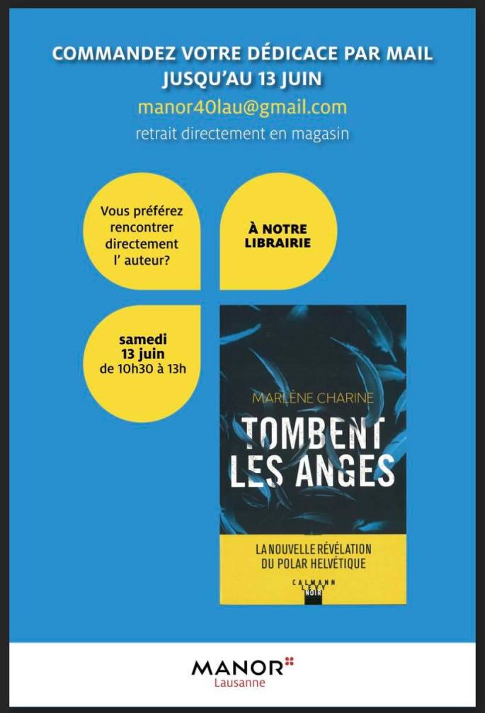 Après ces annulations en cascade, je me réjouis de cette rencontre prévue à la librairie de Manor Lausanne. Il est possible de commander votre dédicace en avance, mais bien sûr, je serais ravie de vous y retrouver en vrai et en live!