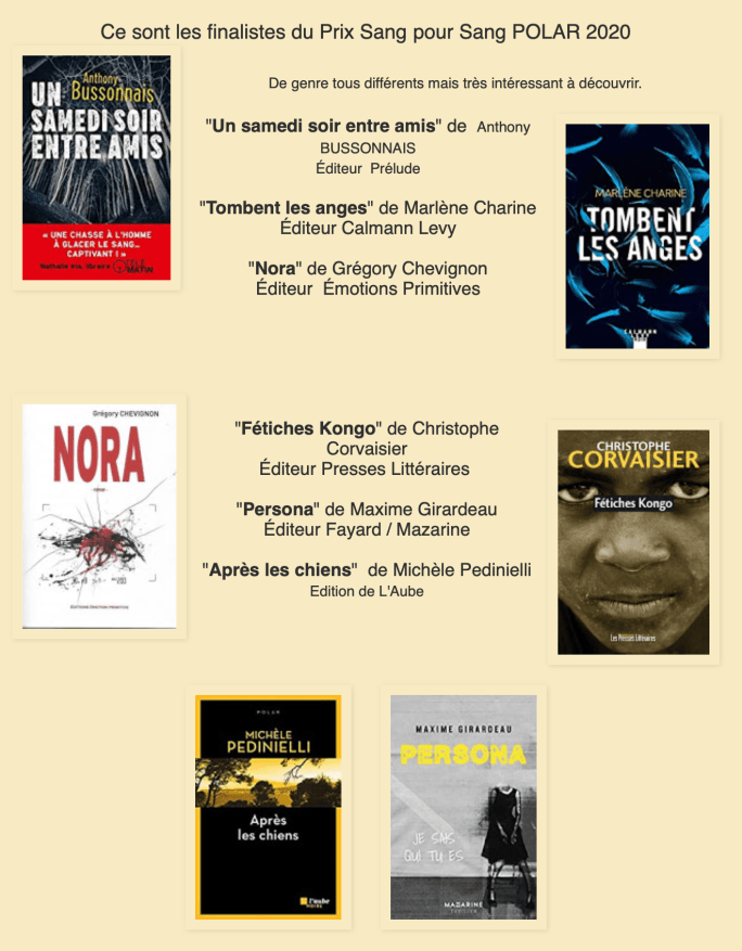 Et donc, un vilain virus a cherché à gâcher les débuts de « Tombent les anges ». La fermeture des librairies n’aura pas empêché certains de le lire… et de l’apprécier! Le voici donc en lice pour trois prix, prêt à se frotter à de grands noms du noir.